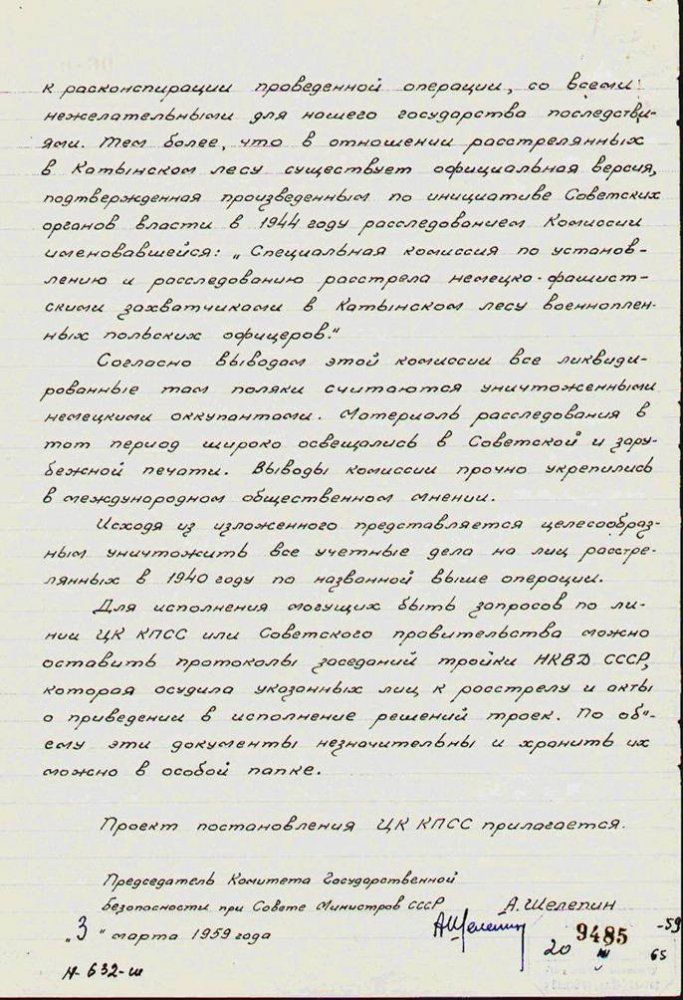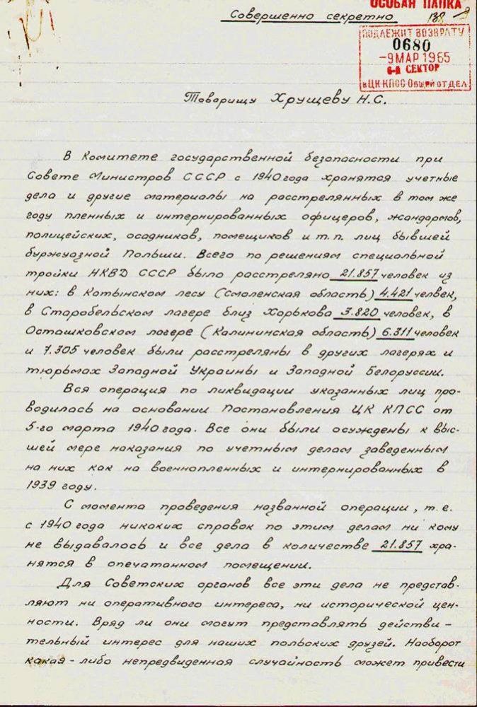 приказ Сталина - Шелепину был на суде в 92 году, потом его изъяли, ибо смеху над ним было много. второй документ - записка Шелепина, которая явная подделка, ибо написана от руки, а печати проставлены, как на официальном документе. и только третий документ - это записка Берии - менее других походит на фальшивку, однако и в нём есть куча помарок, но не смотря на эти помарки, над ним можно было бы подумать, если бы не одно но: в 92 году он был с датой 5 марта, а в 96 всплыл уже без даты, а когда попросили предъявить подленник, а не копию, то тут же все стухли и до сих пор никто подленника не предъявил.