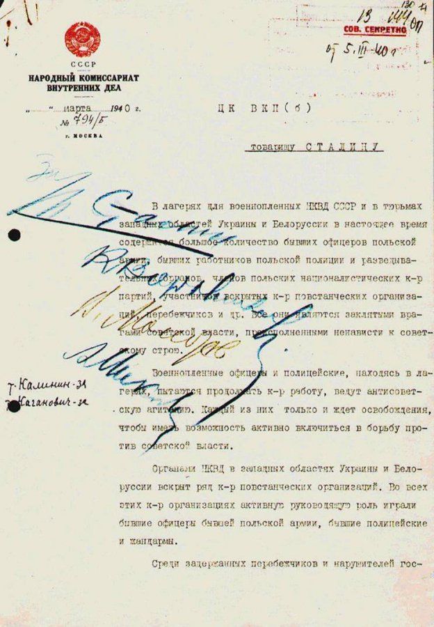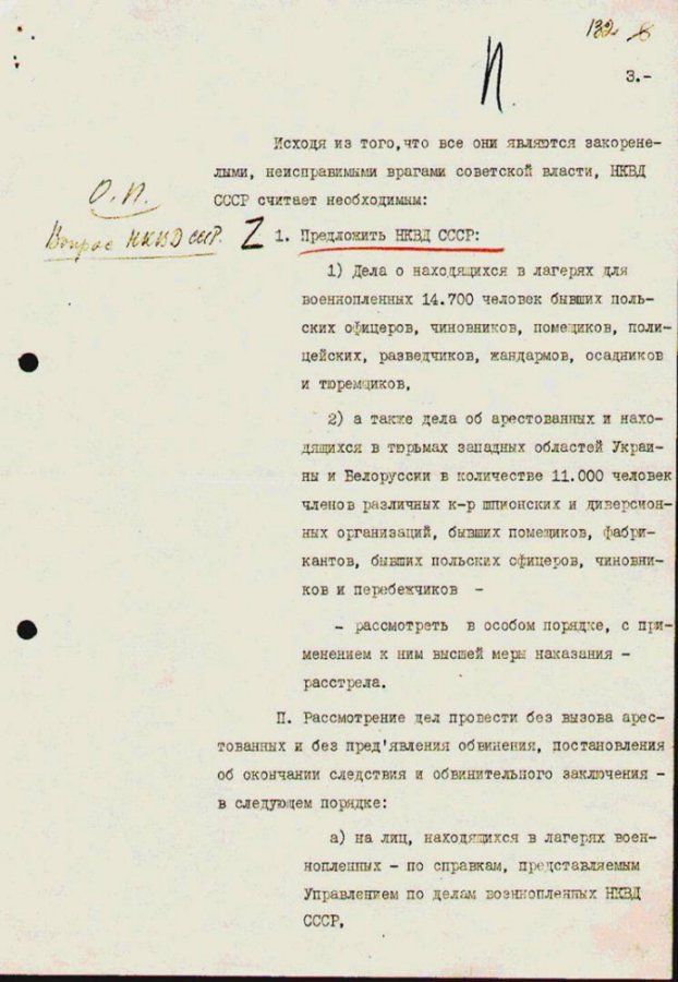 Эта записка Берии всегда имела дату "5 марта", написанную ОТ РУКИ, смотрите на приведенном скане. Некто ошибочно счел, что там же была и пропечатана дата 5 марта, в то время как на машинке пропечатано только МАРТ 1940. Какой смысл поддельщикам был удалять дату с машинопечатной строки, и оставлять написанную ручкой? Вы хоть головой то думаете иногда?