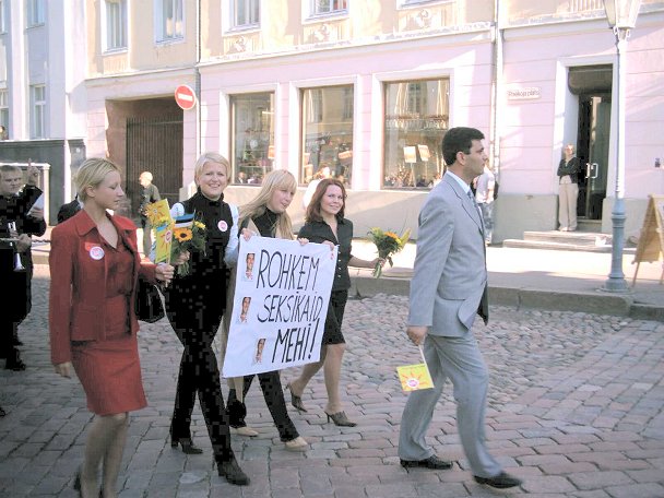 Глобалисты шли колоннами, пели песни о любви к Эстонии и несли лозунги "Больше солнца!" и "Больше сексуальных мужчин!". Последний лозунг изображен на фрагменте, и видно, что несущие его девушки слегка стесняются своих простых желаний.