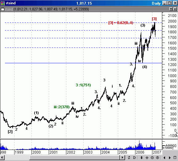 Покликушествую слегонца... Три месяца назад, в декабре 2007, я решил сделать паузу в своих биржевых спекуляциях - по одной из макромоделей получилось, что бычий рынок 2002-2006 годов закончился, и нас ждет длительный, на один-два года, коррекционный боковик. Поэтому в нижеследующем графике я лицо заинтересованное - сам на бирже не играю и другим не даю. Но тем не менее, оцените красоту эллиотовской картинки по индексу РТС на нынешний момент:  Если разметка верна, нас ожидает падение индекса РТС к уровню волны (4) - 1200-1300 против нынешних 1800. Но неприятно даже не это, а то, что падение может затянуться на длительное время, подобно коррекции американских индексов в 2000-2003 годах. В этом случае любая игра на бирже в ближайшие годы рискует обернуться для неспециалистов серьезными убытками. Так что не говорите, что я не предупреждал :) |