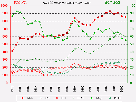 Красным цветом выделены 3 основные причины смерти: Болезни Системы Кровообращения, НовоОбразования и Внешние Причины. Зеленым - менее популярные, для них даже шкала в 10 раз меньшая: Болезни Органов Дыхания, Болезни Органов Пищеварения, Инфекционно-Паразитарные Заболевания.