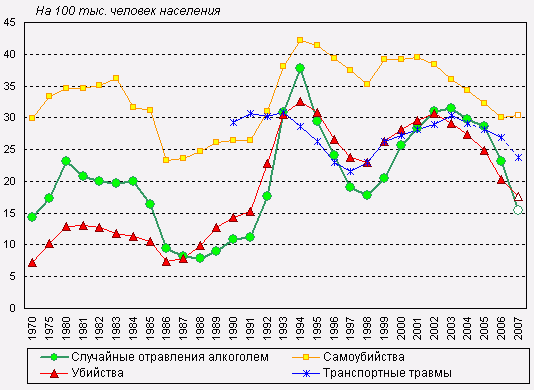 Опаснее всего, как видите - самоубийства, далее идут транспортные травмы, убийства и отравления алкоголем (!). Таким образом, исключив из рациона потенциально опасный алкоголь (водку в общепите, печально знаменитую Балтику № 9 и т.д.), а также не злоупотребляя самоубийствами, можно вдвое снизить риск "внезапной смерти". Еще несколько процентов добавит привычка пристегиваться в автомобиле и успешно законченные курсы безопасного вождения. А вот как быть с убийствами - тут я в такой же растерянности, что и в случае с раком. Должны быть наверное какие-то способы - но какие? Пока не знаю.
