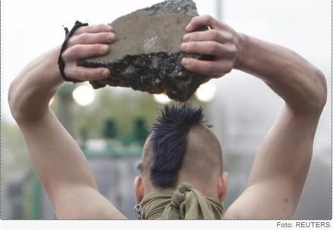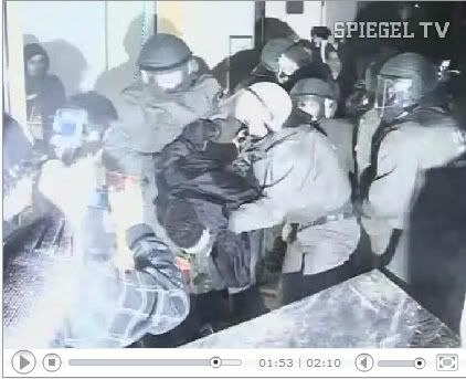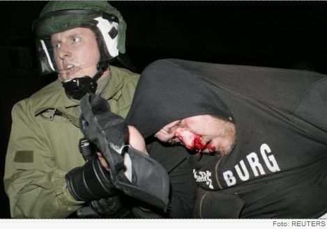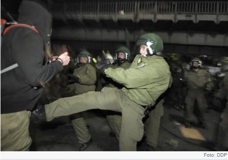 [Тут можно увидеть красивый переход от призыва помешать проведению легальной акции неонацистов ненасильственным путем с прямым отождествлением "леваков" с террористами и террористическими методами. Интересно, автор знает про презумпцию невиновности? И не боится ли он получить штраф/срок за клевету (наверное, надеется на незнание немецкими "леваками" русского языка? Я вот очень сильно сомневаюсь, чтоб "активисты левых движений" призвали "ловить и вешать", а так же решились поставить под удар жизни тысячи простых граждан Германии. Последним отличаются как раз правые.]относит по принадлежности к праворадикалам. Далее, обещанная война левых с правыми оканчивается двумя побитыми журналистами со стороны правых и 20 полицейскими со стороны левых. Бедные беззащитные полицейские (скафандры бронежилетов, броневики-водометы...) еле еле отбиваются от наседающей красной чумы массовым применением дубинок и газа и случается чудо на Марне с обратным историческому исходом: 250 человек задержано. Благодаря автору неизвестен хронологический порядок действий: то ли левые подожгли машины, за что их стали поливать из водометов, то ли их стали поливать из водометов, за что они подожгли машины.]