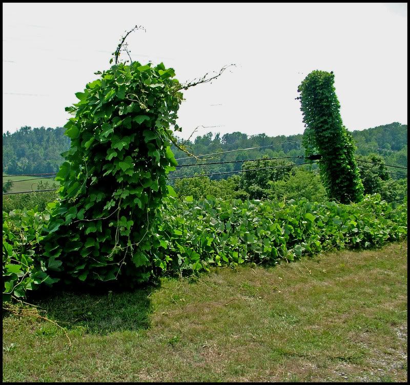 Вот это ползучее повсюду растение было привезено в 20-х годах из Японии в Теннесси для укрепления склонов. Склоны оно укрепило, что не удивительно - длина корня такой штуки достигает полутора метров. Но кроме укрепления почвы, это ползучее также оплетает вообще всё, до чего дотянется и душит, душит... Теперь с ней борются, как могут, но результаты неутешительны, в основном из-за той же глубокой корневой системы. Ни яды не помогают, ни выжигания зарослей, ни лопата... Короче - японская напасть.