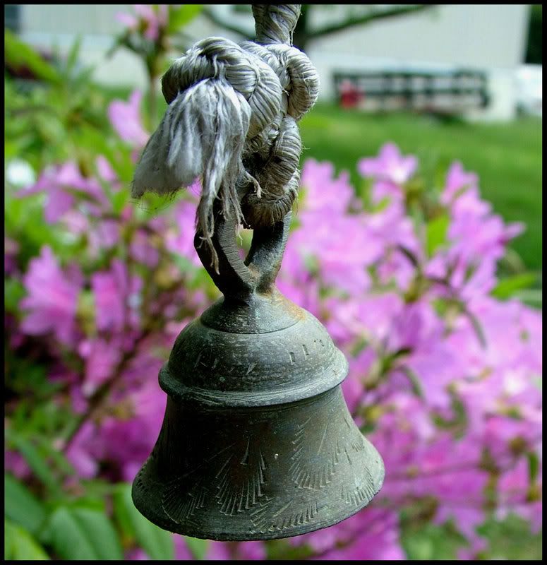 Веревка сверху под обрез - шея и пол затылка, узел - плечи и руки, согнутые в локтях, кольцо звонка - ноги. :)
