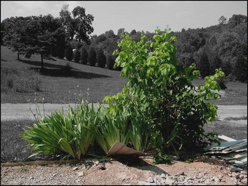 На первом снимке пейзаж мрачноват. И куча строительного мусора мешает насладиться ирисами. ;)