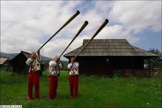 Гуцулы, играют на трембитах втроём. " - Далай Лама слушает!"