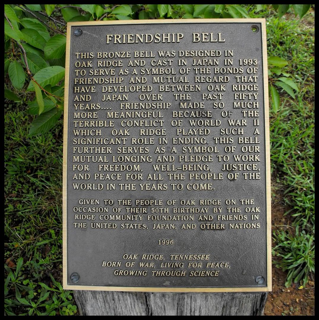 2.  Это, друзья мои, Колокол Дружбы. Спроектирован у нас, в Оак Ридже, а отлит в Японии. Символизирует американско-японскую дружбу навек. Дело в том, что Оак Ридж был построен в 1942 году, специально для проекта "Манхеттен". Здесь обогащали уран. И продолжают это делать, между прочим. Одно из старых предприятий, ныне закрытое, фонит по сию пору. Ну, да речь не об этом. Японцы отлили этот колокол в знак того, что больше не обижаются, надо полагать. Или как вечный укор. Какими бы соображениями они не руководствовались, колокол получился на загляденье - большой, красивый и очень громкий. Каждый желающий может брякнуть в него специально подвешенным для этого бревном.