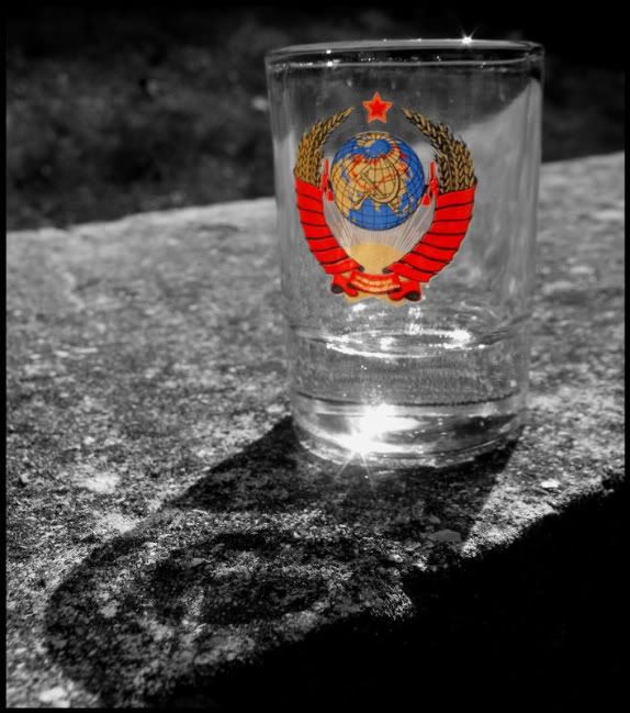 Прикольно было бы набор таких стаканов. На одном - герб СССР (лучше на графине), на остальных - двухголовая птица, трезуб и т.д.