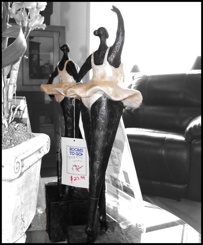 1.  В мебельном магазине Rooms To Go предлагают вот таких керамических балерин (примерно по полметра ростом) для украшения, оживления и тому подобного феньшуя жилища. Никаких фотошопных манипуляций, кроме отрывания девушек от фона, не производилось. То есть - аффтар иммено такими балерин и видит.