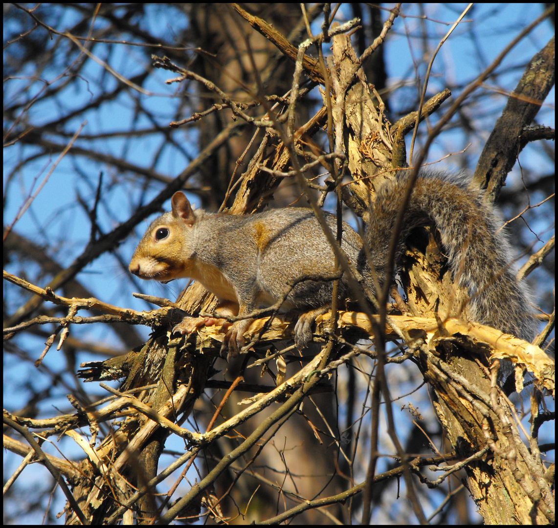 с земли. она на дереве сидела, шли две собаки и одна из них страшно заинтересовалась чем-то наверху. так я эту белку и обнаружил, проследив за собакиным взглядом))