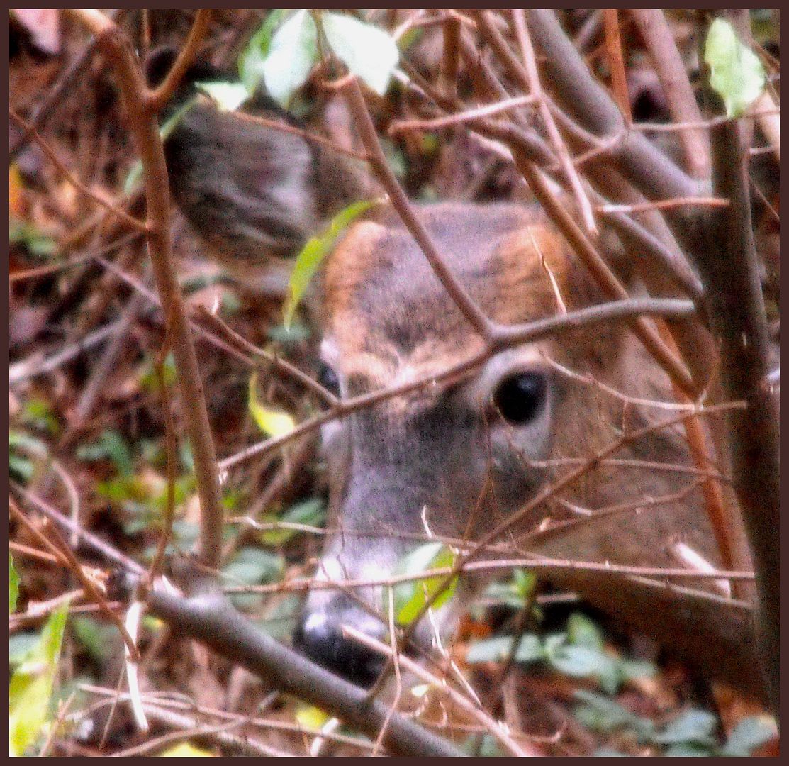 Опять приходили олени. Мамка с дитями. У детей чёрно-белые хвосты и расшатаные нервы. Увидел я эту команду из кухни, через дверь и противонасекомую сетку. Дверь мне открыть удалось, не вспугнув стадо. Сделал неск.фоток сквозь сетку, что - как всем прекрасно известно - качества снимков не обеспечивает. При попытке открыть сетку, звери всполошились и ломанулись сквозь заросли вверх по сколну. Но только дети, мамаша спокойно спряталась в густых кустах и продолжала обед. Сфотать мне её не удалось, только телятинку.