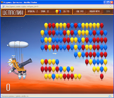 Воздухоплавание-по-выходным. Баллонофобам на заметку! Помните тупую дирижаблененавистническую игру "Balloon Invasion" ( http://st-fuodoroff.livejournal.com/17986.html), про которую я вам уже расказывал? Вот вам не менее тупая игра, но теперь для тех, кто любит дирижабли, а аэростаты, напротив, ненавидит. Это - игра «Цеппелин», весёлый маразм от «Тындекса».  Ваш дирижабль (более похожий по цвету и форме на изобретение придворного доктора английского короля Карла II) попал в область высокой концентрации воздушных шариков. Отставить улыбки! Эти цветные пузыри опасны для пассажиров цеппелина. Нужно срочно зарядить пушку и расчистить путь! Ваша задача - уничтожить определенное количество воздушных шариков ограниченным количеством выстрелов. В полете вам встретится несколько видов воздушных шариков: - Обычные разноцветные шарики - просто лопаются; - Шары со стрелкой - дают еще один выстрел; - Шары с буквой Я - дают тройной выстрел; - Шары с иглой - уничтожают ряд шаров внизу; - Шары с рожицей - уничтожают все шары того же цвета. Кроме того, вам придется преодолевать стены: стальные, деревянные и резиновые. Стальные стены блокируют полет стрелы, деревянные при первом попадании разрушаются, резиновые отражают выстрел. Игра разработана по заказу компании "Яндекс" агентством "Брэйн Шторм" (да, у пацанов мозг в момент создания этого штормило крепко). Наслаждайтесь, дорогие баллонофобы: http://games.yandex.ru/game.xhtml?game_id=73 ! | | 7:52 pm |