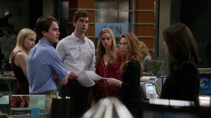 Практически все рекаперы после двух первых серий отметили, что Соркин учел критические замечания и теперь сериал похож на что-то человеческое. А главное, канал нанял консультантов, которые объяснили Соркину, как на самом деле работает новостная программа. Но недолго музыка играла, недолго зритель танцевал. В третьей серии всё вернулось на круги своя: упоминание Дон Кихота - есть (сколько можно уже!), речи о благородной миссии журналистики - есть, обличения политиков, в основном республиканцев, - есть, женщины опять криворукие идиотки - есть, нелепые и нелогичные ситуации - есть. Полный букет. Здравствуйте, Аарон Соркин, с возвращением. Уилла насильно возвращают к событиям прошлого сезона - помните его звонок на голосовую почту МакКензи с признанием Уилла в том, что он под кайфом и что он по-прежнему любит свою продюсершу, который подслушала противная светская журналистка Нина Хавард? МакКензи через несколько месяцев тоже про него вспомнила и терзает Уилла, что же он там такого наговорил. А Уилл не знает, что сообщение было стерто Ниной, и МакКензи знает только часть его содержания и то с чужих слов. Теперь оказывается, что Нина еще и в курсе, что у Уилла не было никакого гриппа и выпуск об 11 сентября вышел без него по другим причинам. Оооо, она теперь это расскажет всем в своём таблоиде! Мне по-прежнему удивительно, что таблоиды так рьяно интересуются служебными отношениями на одном из многих кабельных каналов. В споре с Чарли Уилл вспоминает о своей миссии "цивилизовать" всех и предлагает рассказать Нине правду, возвав к её человечности. Ну всё же в честь 11 сентября можно обойтись без сканала. Что он и деалет - устраивает встречу с ней и рассказывает ей всё-всё, хотя это "всё" и так очевидно - только ленивый не знает про "американский Талибан", понятно же, что канал должен был как-то отреагировать на выходку Уилла, вызвавшую такой скандал. Не говоря уже о том, что такие вещи мало интересуют светских хроникеров. Так или иначе Нина вняла голосу совести, особенно после того, как Уилл сказал ей всю правду (что его отстранил Чарли, а не Леона). Вся эта история абсолютно дутая и нужна была лишь для того. чтобы создать очередную любовную коллизию - Уилл хочет встречаться с Ниной, а Нина знает, что он любит МакКензи, и говорит ему об этом, но в результате всё же спит с ним, а МакКензи так ничего и не узнала. Мусолить одну и ту же ситуацию, постоянно к ней возвращаясь, видимо, фирменный приём Соркина. Джим всё страдает в автобусе Ромни: пресс-секретарь и пиарщица скармливают журналистам одни и те же общие слова, Ромни просто демагог, репртажи снимать не о чем. Собственно, Джима бесит ровно то же самое, что не понравилось мне в интервью Навального. Ромни отделывается размытыми формулировками и критикой Обамы, но не говорит ничего конкретного о своей программе, каким образом он собирается решать проблемы, он не отвечает на вопросы и вообще избегает контактов с журналистами. Более того, заявление Ромни о том, что он создаст 12 миллионов рабочих мест, оказывается подтасовкой, потому что агентство Муди в своем прогнозе писало, что в ближайшие 4 года рынок труда увеличится на эти 12 миллионов мест независимо от того, кто будет президентом. И это не единственное серое пятно в его программе - многие цифры являются результатом манипуляций, расчитаных на невнимательность. 