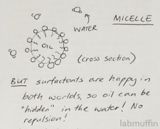 Разоблачение Чтение косметических блогов переполняет меня тихой ненавистью. Помните, я подвесила персонал магазина Ив Роше, спросив продавщицу, что такое "мицеллярный"? Теперь я читаю описания волшебных свойств "мицеллярки" и тихо офигеваю. Слово "мицеллярный" происходит от слова "мицелла". Мицелла - это очень маленькая частица, остоящая из молекул или ионов, в которой "гидрофобный радикал связан с полярной (гидрофильной) группой". Проще говоря (физики и химики, зажмурьтесь в этом месте, я объясняю для самых маленьких, пропустив всякие слова вроде "дисперсная фаза", "гетерогенный" и "неионогенный"), если говорить о водных растворах, красный кружочек (гидрофильная "голова") дружит с водой, а синий (гидрофобный) хвостик - не дружит, зато он дружит с жиром. Вот так выглядит сферическая мицелла (мицеллы бывают не только сферические, но нас интересуют именно они) - снаружи гидрофильная оболочка, внутри олеофильные хвостики: Что эти мицеллы делают? В нашем случае, а мы говорим о бытовых средствах, они служат мостиком между двумя несмешиваемыми веществами - водой и жиром. Именно присутствием мицелл в нужном количестве обусловлено действие поверхностно-активных веществ - ПАВов. Задача ПАВа - снизить поверхностное натяжение. Жир не растворяется в воде. Чтобы смыть его, нужен ПАВ: вы капаете средство для мытья посуды на жирную поверхность, смоченную водой, и видите, как разрушается жировая пленка. ПАВы входят в состав всех моющих средств, начиная с банального мыла и заканчивая шампунем и стиральным порошком. Понятная картинка "мицелла в ПАВе": via labmuffin Совсем примитивно: гидрофобное ядро цепляет жир, а гидрофильная оболочка позволяет все это смыть водой (физики и химики опять зажмурились, чтобы не читать моих объяснялок). Сам по себе термин "ПАВ" не свидетельствует о какой-либо опасности для кожи, всё зависит от химического состава, ПАВы могут быть более или менее агрессивны в зависимости от области применения. Понятно, что средством для мытья посуды можно помыть лицо, но оно предназначено для устранения более серьезных загрязнений и обойдется с вашей кожей как со сковордкой. Мицеллярная вода содержит ровно такое же ПАВ и мало чем отличается от густого мыльного раствора (мыло, которым вы пользуетесь, тоже ПАВ, ужас-ужас-ужас!). Да ничем не отличается, если честно, - она смывает жир и грязь ровно по тому же принципу и там тоже есть мицеллы. Просто мицеллярная вода мягче по составу, и остатки жирных кислот из "хвостика" можно не смывать водой (как уверяет производитель), достаточно снять их ватным диском (но я бы всё же смыла водой). Мифы и легенды о мицеллярной воде, вычитанные мной у косметических обозревателей: 1. "Мицеллярная вода не содержит щелочи и других ПАВов" - щелочь не ПАВ, а вот мицеллярная вода очень даже содержит ПАВы, и ничего страшного в этом нет. 2. "Мицеллы - это эфиры сложных кислот" - мицеллы - это отдельные коллоидные частицы. Я не знаю что еще за "сложные кислоты, а вот эфиры действительно бывают простые и сложные, но девушкам это всё равно ни о чем не говорит. 3. "Мицеллы глубоко проникают в кожу" - не знаю, куда они там проникают, их задача устранить поверхностное загрязнение. Кожа - орган, отвечающий за то, чтобы в нас не проникало что ни поподя. 4. "Мицеллярная вода - очищающее средство нового поколения" - ну не новее обычного мыла. 5. "Любая вода по су
