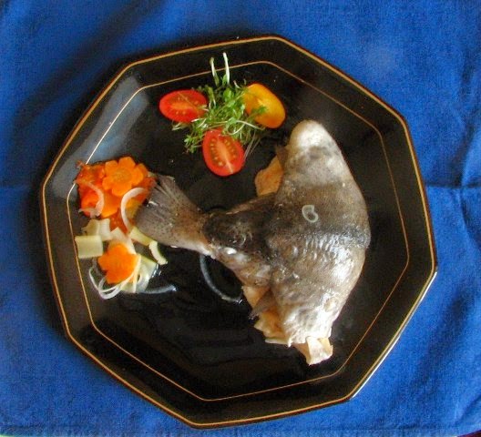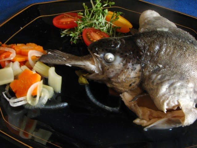 Форель по-ганнибальски Я тоже попробовала приготовить что-нибудь по мотивам "Ганнибала". Выбор пал на truite au bleu из восьмой серии, подачу самой рыбной тушки я скопировала у Дженис Пун. Именно такая подача была придумана специально, чтобы рыба выглядела как-нибудь пугающе, но в ней есть и практический смысл - чтобы так завернуть рыбу, надо вытащить позвоночник со всеми мелкими косточками. Мелкие форельки продаются у нас в Ленте, рецепт посмотрела в сети. |
