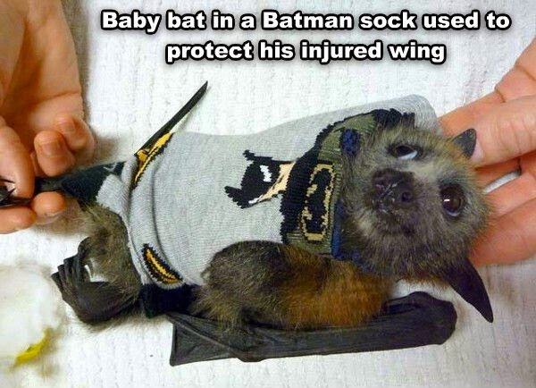 Летучий мышонок (по-моему, это фруктовая мышь) в носке с Бэтменом, который на него надели, чтобы не повредить раненное крыло: