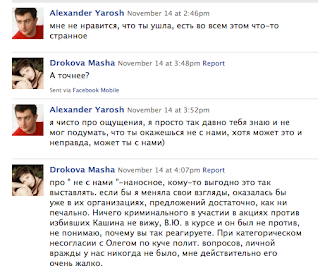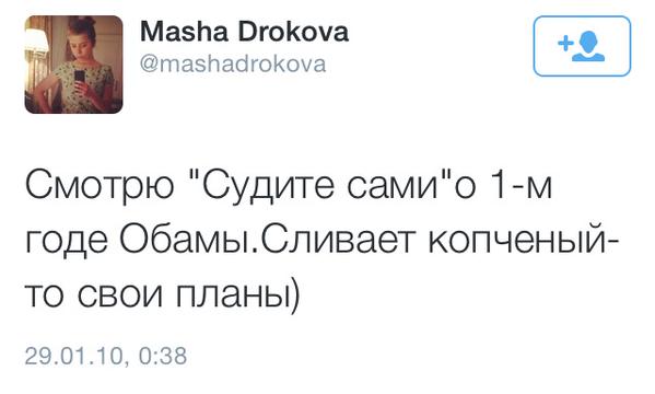 Маша и пиар - ч. 4 1-ого августа этого года Маша Дрокова опубликовала в своем твиттере сообщение: В комментах полетели камни и навоз. Оказывается, в отношении Наших формула "не забудем, не простим" не просто мем. И только Эстер Дайсон (гуглим) написала, что она рада, что Маша счастлива. А ведь было еще машино поздравление 4-ого июля, но его пропустили, а ведь там уже прозвучало слово home: Happy Birthday America! With all my love to Russia I'm very grateful to be here surrounded by active, smart and positive people and to feel that I'm at home. And yes, for me it's the best country to live, dream and to realize dreams. Там же поблизости нашел себе home и Ашот Арамович Габрелянов. Кстати, вот он на машиной фотографии. В любом случае, они там встречались в интересной компании, мы к этому вернёмся. Ашот Габрелянов проявляет такую же поразительную гибкость позвоночника. Из его чудесного интервью ВВС (ничего не знаю-за папу не отвечаю-мы просто публиковали новости-какие прослушки?-ах это...): В.К.: Вы приехали сюда навеки поселиться? А.Г.: Нет. Для меня самое дорогое чувство - это чувство свободы. Мне хочется чувствовать себя свободным. Я гражданин России, я люблю свою страну, я хочу находиться там, где мне комфортно. Если я почувствую, что мне комфортнее работать в какой-то другой стране, я поеду работать в другую страну. Но здесь сейчас просто больше возможностей. Как изящно он лавирует между "любовью" и "комфортным нахождением". Всё бы ничего, если бы совсем недавно вместе с папашей они не орали благим матом про пиндосов и госдеп. Печеньку, Ашот Арамович? И смотри-ка, не отсохли ножки-то в проклятое американское посольство сходить. Но натуру-то не пропьешь вот так сразу в Вильямсбурге: В.К.: Война будет между Россией и Западом? А.Г.: Война уже идет. Холодная война. Информационная война очень сильно идет. В.К.: Как вы думаете, кто в этом больше виноват? А.Г.: Было бы, наверное, несколько некорректно выделить кого-то одного. Страны играют в пинг-понг. Что было раньше, курица или яйцо. У Америки свои интересы, у неё свои интересы на Ближнем Востоке, на ресурсы, на установку там ракетных комплексов. У России - свои интересы. Да уж поняли мы - война идет, и поэтому Ашот быстро свалил туда, где комфортней. Там, в условиях информационной войны комфортней развивать свой информационный бизнесок. Поздравляю, Америка, с приобретением. Вы сами его приняли, надеюсь, он будет полезен вашим МЗС. От нашего стола. Вернёмся к Маше. Это всё сейчас. А каких-то пять лет назад, нет, это совсем недавно же, было вот так: Метаморфоза случилась буквально за несколько месяцев. Не, не из-за Кашина. После поездки в Данию с режиссершей фильма. Вот так репостила Рыкова и Взгляд, как до того Путина и Якеменко, а после - Белоусова, у неё всегда был "самый лучший начальник", а потом вдруг стала интересоваться стартапами, соцсетями и Дуровым. И ушла с Раша.ру. Соратники были в растерянности. Особенно Потупчик, для которой преданность чего-то значит. Но больше всего Наших волновало, не сдаст ли она их врагу, не наболтает ли лишнего. Дрокова ведь была не рядовой нашисткой с барабаном, и не мелкой функционершей, она была Большой Шишкой, федеральным комиссаром. Они даже послали к Дроковой Яроша поговорить: Этот скрин был отправлен вышестоящим. Видимо, ей поверили. Но обиду затаили. Дрокова тогда в 2010 уже сидела со своим агентством "Легенда", вместе с Филоновым они начали окучивать соцсети. В методическом письме Потупчик был та