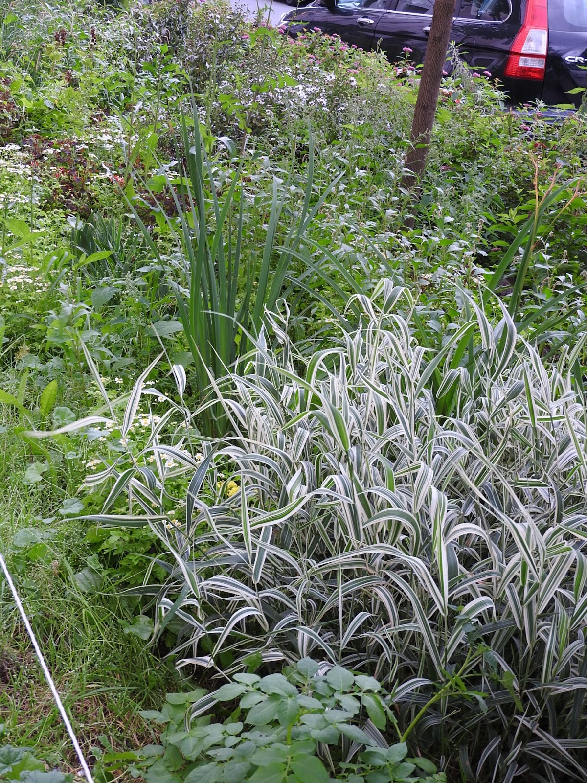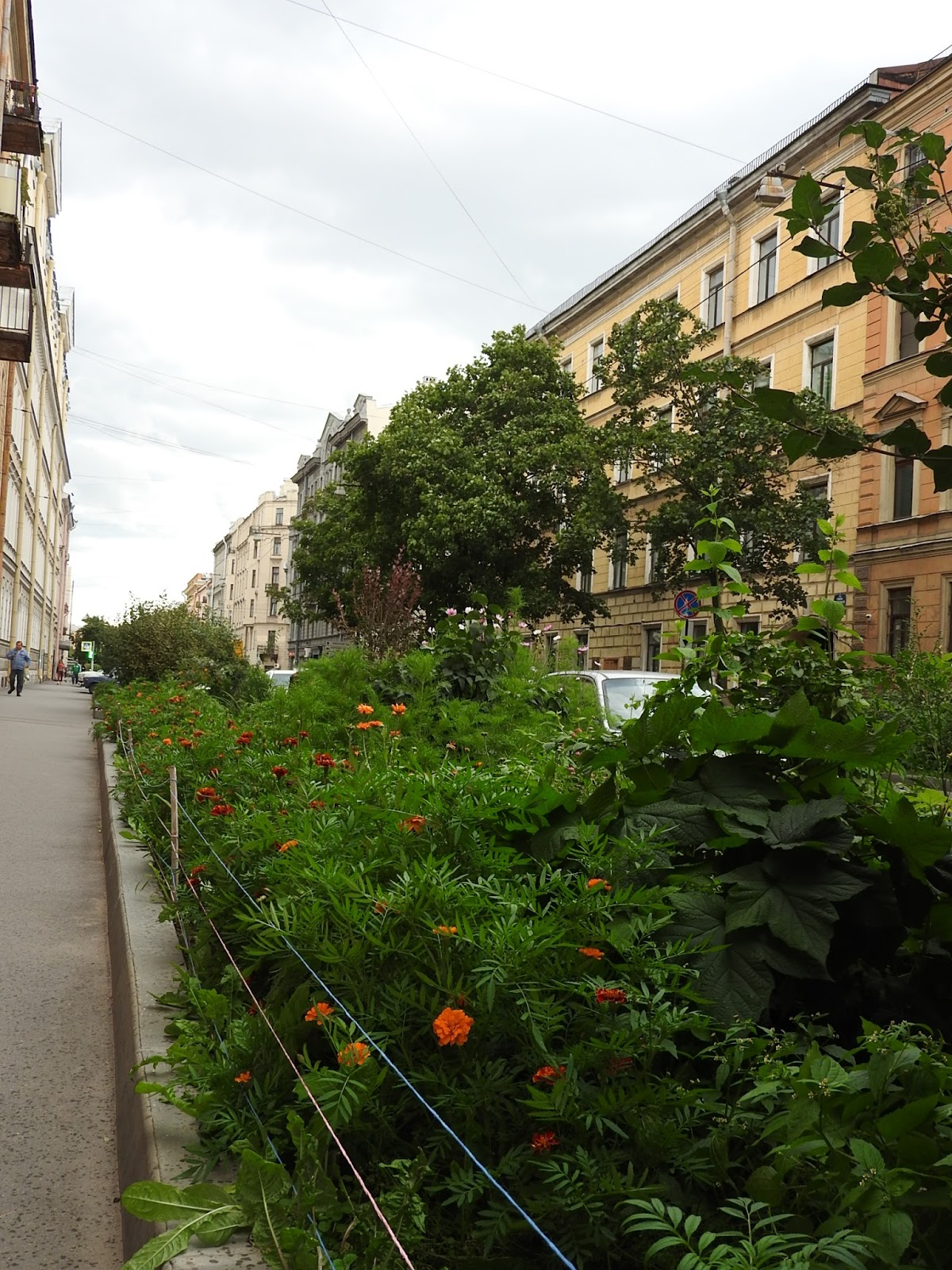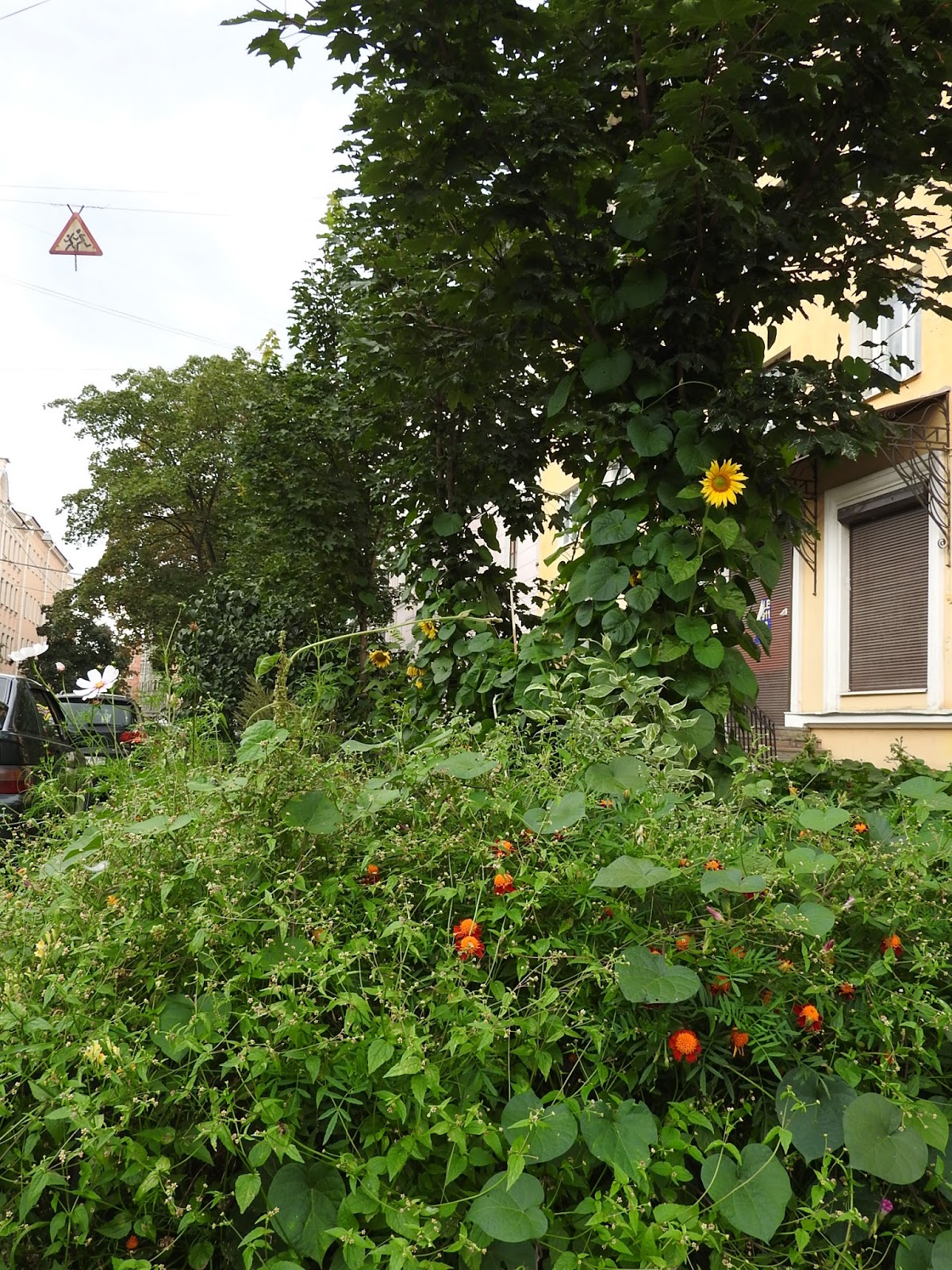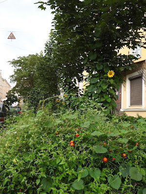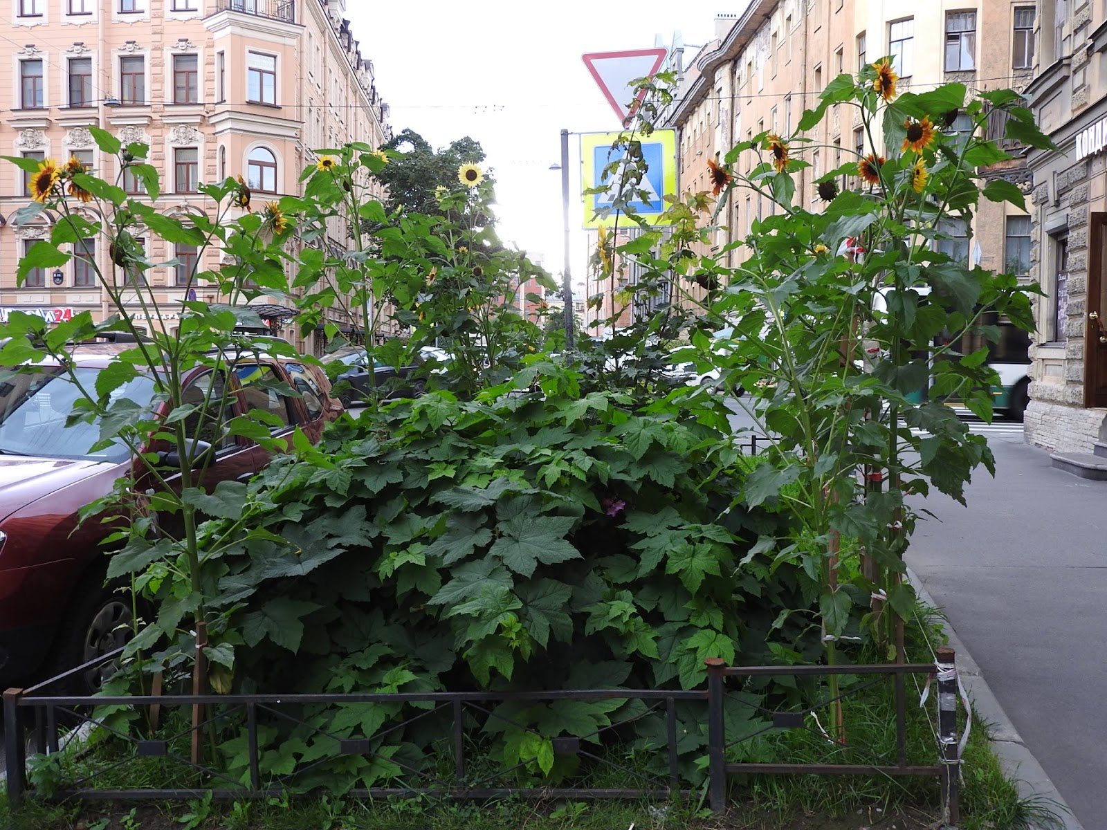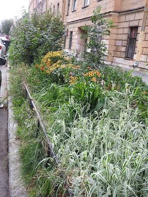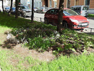 Еще садовое Продолжим экскурсию по тайному садоводству нашего города. Газоны на маленьких улицах - главное поле для ландшафтных экспериментов. И ведь у людей действительно то, что называется, зеленые пальцы, на такой земле что-то вырастить. Кто говорил про подсолнухи в прошлый раз? Вот, пожалуйста: По-моему, это свёкла: Вот эта сирень, и маленький дуб, и клен - это всё самодеятельные посадки. Понимаете, человек растит дуб из прутика! На другой стороне так выросли вполне взрослые берёзы: Микроцветник: А еще у нас во дворе по соседству растет вот такой черный шиповник: |