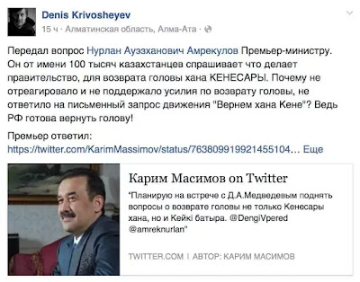 Голова Ко мне третий день ходят спамеры со ссылками на какой-то убогий казахский новостной сайт, причем сами спамеры из Украины, вот они, плоды глобализации. Но вот и от спама бывает относительная польза. На этом сайте я узнала, что руководство Казахстана ведет с Медведевым переговоры о возвращении головы. Даже двух. Полагаю, что дело о голове хана Кенесары для жителей Казахстана имеет примерно такую же важность, как вопрос, захоранивать ли Ленина, но всё равно смешно, извинити. Если верить Википедии, отрубленная голова была послана в Омск в 1847-м и там затерялась. Но в Казахстане есть своя скрепа: Среди казахстанцев бытует мнение, будто голова Кенесары хранится и по сей день в Кунсткамере или Эрмитаже. После официального запроса генерального консульства Казахстана в Кунсткамеру 4 ноября 2004 года, директор МАЭ РАН Юрий Чистов и заведующий отделом антропологии МАЭ РАН Валерий Хартанович написали ответ, в котором говорится, что «предмета „голова Кенесары Касымова“ (как и других предметов, относящихся к этому историческому деятелю) в фондах Музея антропологии и этнографии имени Петра Первого (Кунсткамера) не обнаружено. Не имеется также никаких документов, свидетельствующих о нахождении ранее в нашем Музее каких-либо предметов, относящихся к Кенесары Касымову» Медведев сказал, что поищут. Однако, всегда найдется, чем занять умы населения. |