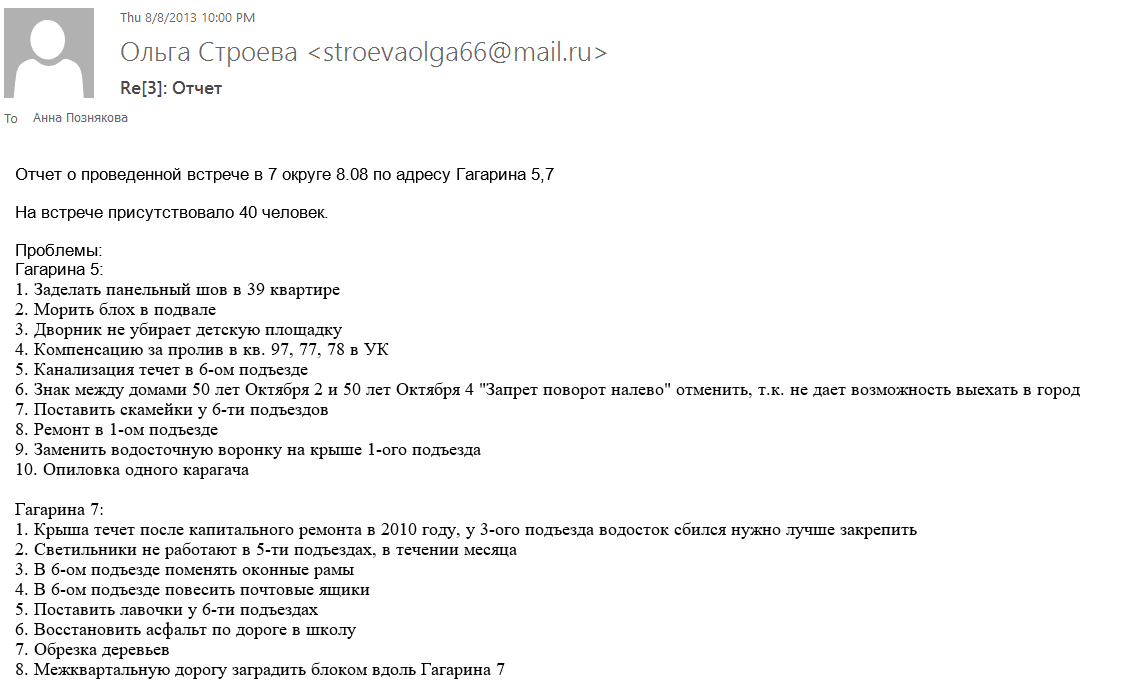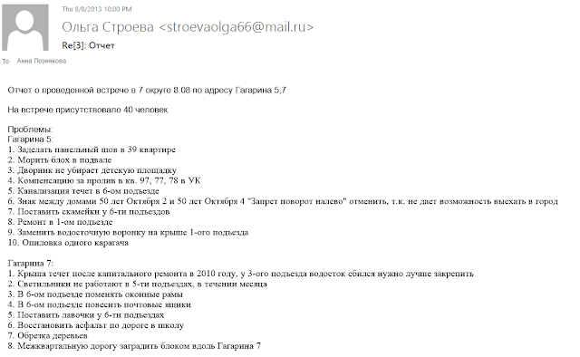 На встречу выборам: морение блох Шалтай сливает переписку какой-то мелкой функционерки из Сызрани. Во всю идет предвыборная агитация Единой России, работа кипит, с жителями встречаются. Вот отчет по результатам встречи: Я очень понимаю жителей Сызрани, читаю и вижу - они мне братья и сестры. Мне, кстати, компенсацию за пролив тоже не мешало бы стребовать: третья протечка за сезон, кровля течет. И мне думается, что это наилучшее применение Единой России - пусть хоть блох в подвале выморят. |