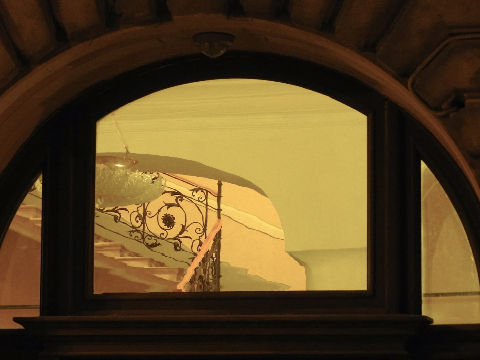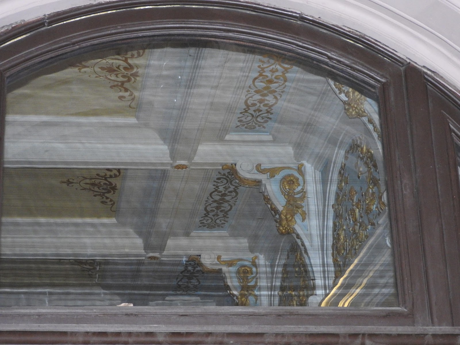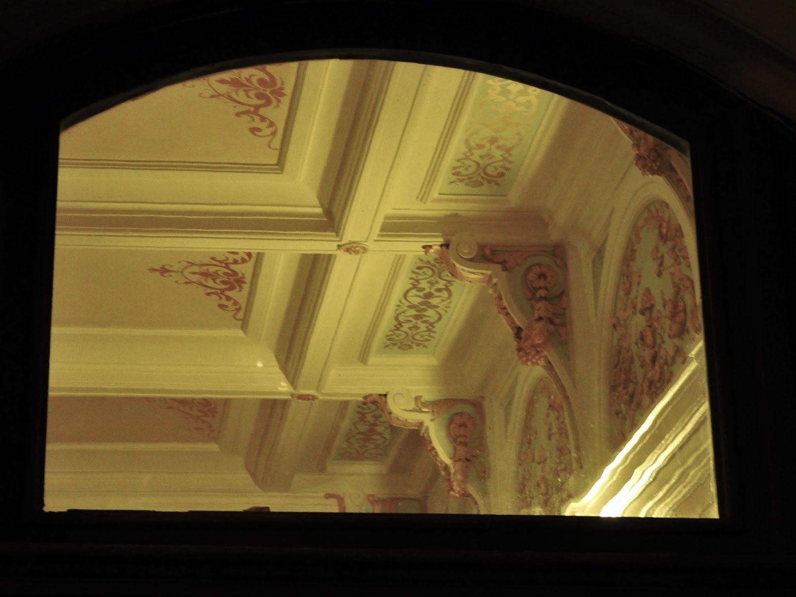 В жилом доме на Стремянной сквозь стекло видно кусок парадной. Отреставрированная лепнина и роспись, люстра, похоже, аутентичная.