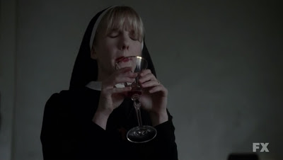 В Мэри Юнис вселился дьявол, в этом уже нет сомнения. Она пугает сумасшедших грядущей грозой и сообщает, что в качестве успокаивающего средства им покажут фильм "Крестное знамение" ДеМилля, где "полно огня, секса и смерти христиан". Одна из пациенток, мексиканка, узнает в сестре Юнис сатану. Долго она не прожила после этого. Мэри Юнис заколола её ножницами, а труп вывезла в лес через тоннель. Сколько же ей пришлось отмывать кровь? Судя по фантану, хлынувшему из ран, палата должна была быть залита до потолка. Мимоходом Мэри приносит сестре Джуд церковного вина под предлогом проверки не разбавляют ли его водой. Джуд не пьет с 49-ого года, когда услышала зов Христа. Обстоятельства, при которых ей открылось её божье предназначение, нам уже известны. А тут еще помада и намёк на любимый цвет сестры Джуд.