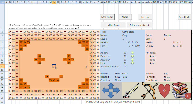 Кэри Уокин написал полноценную RPG игру на Exel, то есть, это по сути набор таблиц, как я поняла. Игра называется Arena.Xlsm, в ней 2000 врагов, сюжет с 4-мя разными финалами, 31 заклинание, 15 уникалных артефактов (какие-то items) и много чего еще. Вот так это выглядит: