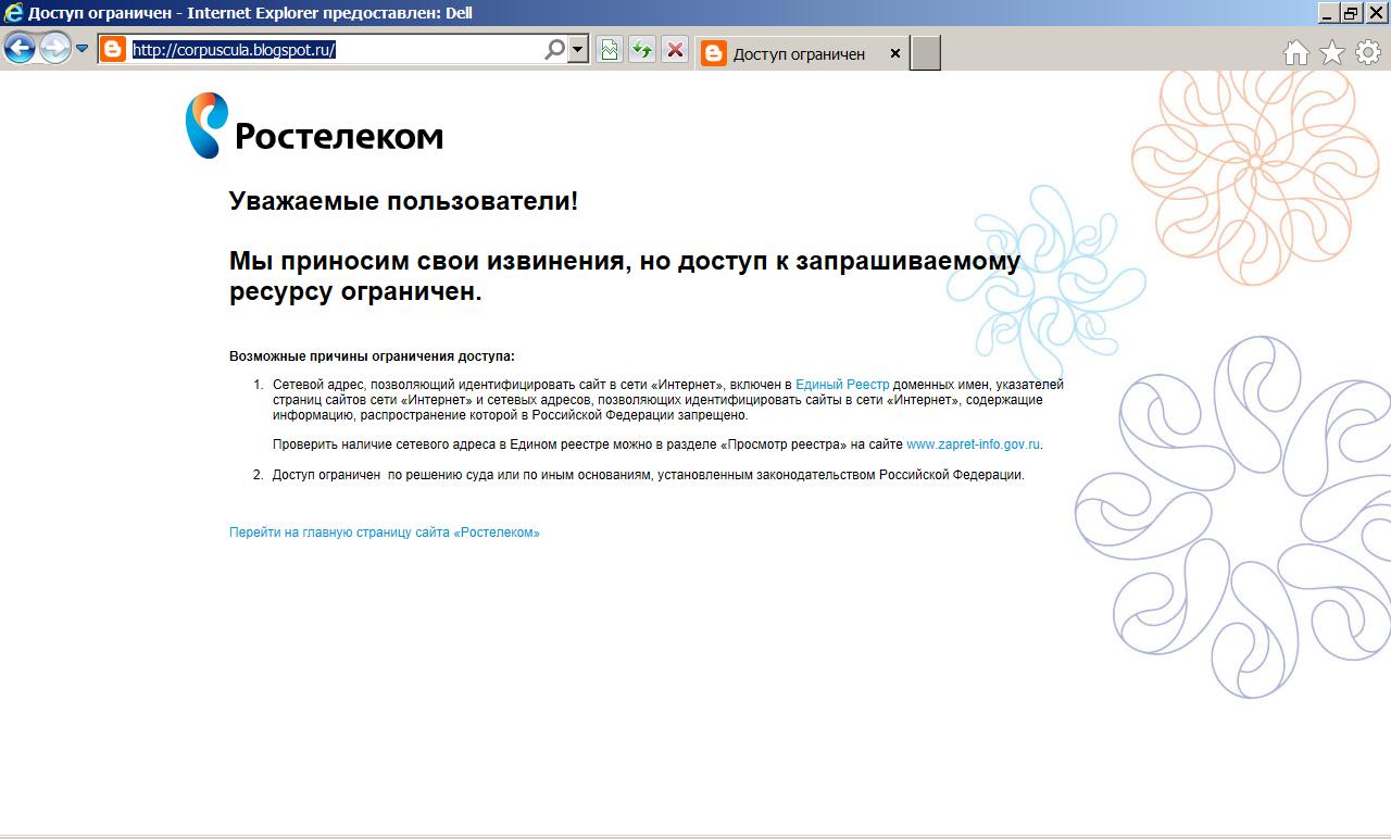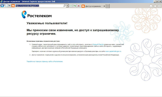 Вестник МЗС Оказывается, МЗС со своим реестром замахнулся даже не на Блогспотец несчастный, а вообще вдарил по Гуглу, скриншот с Жуйка.У меня ровно такая же страница с логотипом Ростелекома вываливается при попытке зайти на официальный блог gmail, хотя провайдер у меня не Ростелеком, в прошлый раз заглушка была ТвоёТВ.
