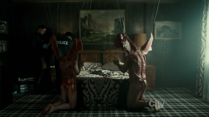 Брайан Фуллер прославился двумя сериалами, и оба они о смерти - "Мёртвые как я" и "Мёртвые до востребования" (Pushing Daisies), "Ганнибал" эту линию продолжает, а пятая серия даже в концентрированном виде - двое героев умирают от рака и их переживания становятся основой сюжета. Остальные пребывают в мире смертей, обставленных как акт современного искусства - что не инсталляция, то перфоманс. Смерть обретает самые причудливые визуальные формы. Оператор с упоением смакует страшные картинки, чтобы работа бутафоров и гримеров не пропала зря. Вот, кстати, тоже у людей интересная профессия - придумывать натуралистичные трупы, да повыразительнее. Представляете, сколько фотографий и анатомических справочников им приходится смотреть "для вдохновения"?