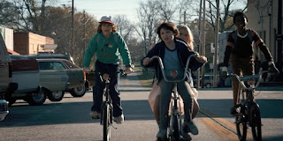 Такое ощущение, что сценаристы собрали все сюжетные ходы и персонажей из фильмов своего детства: тут и секретный научный центр, и заговор, и тайные эксперименты, и маленькая девочка с хвостиками, прямо Дрю Берримор, и нечто, живущее в стене, и контакты с другим измерением с помощью бытовой техники, и добрый пришелец, который умеет показывать фокусы, и безалаберная, но преданная мать, верящая, что её сын жив, и старшая сестра с противным бойфрендом, и очередная песня, с помощью которой связываются сквозь пространство, в этот раз это "Should I stay or should I go" The Clash. И конечно же, мальчики на велосипедах, носители авантюрного духа и вечных ценностей - добра, дружбы, верности. И всё это еще и рассказано тем наивным языком. Проще говоря, сейчас так не снимают.