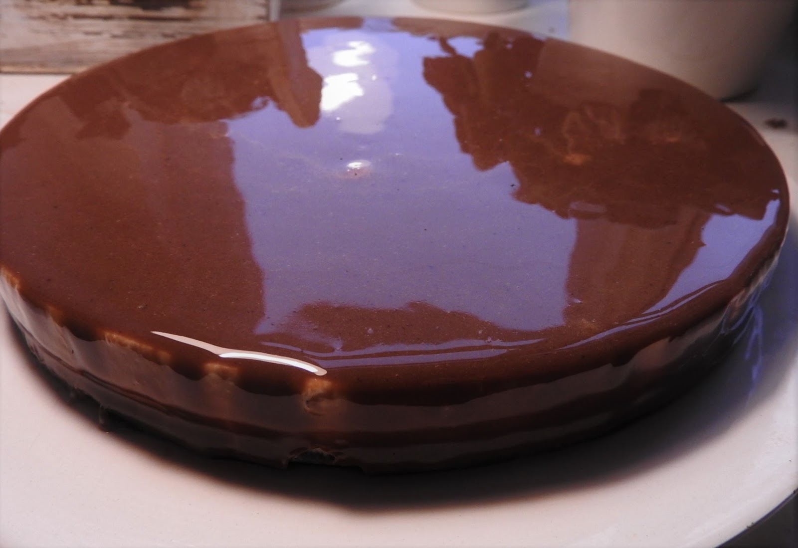 Очарованная блестящей глазурью, по-научному гляссаж, я попробовала сделать нечто подобное. В пропорциях наврала и использовала то, что есть под рукой. У меня не было лимонной кислоты для инвертного сиропа, добавила лимонный сок, а белого шоколада осталось пол плитки, поэтому смешала с черным (покупаю в Призме финский "шоколад для выпечки"). Но оно всё равно получилось! конечно, не так здорово, как у девушек с Ютюба, но он блестит!