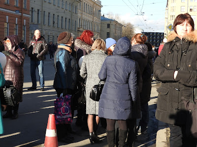 Остальные две трети составляли группы по 10-15 человек в возрасте 45-55, тоже в большинстве своем женщины. Пройдя кордон они ждали, когда к ним подтянутся остальные. Явно люди пришли с работы и все они сослуживцы. Вот такая группа ждет своих: