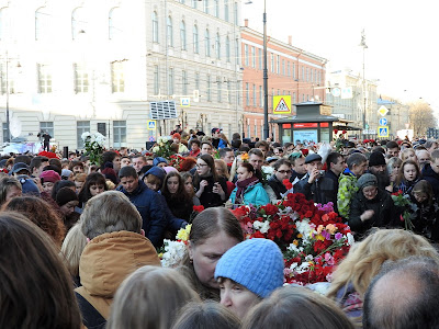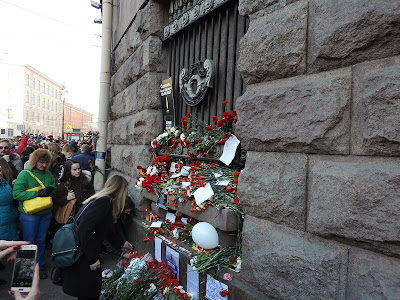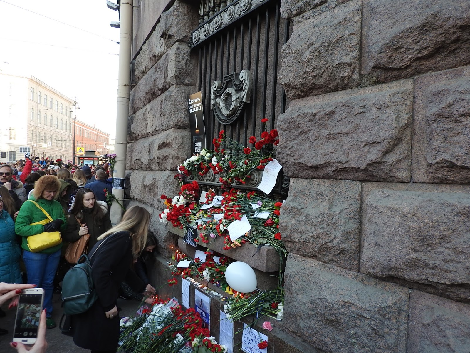 Тут я ушла, сделала маленький круг и вернулась к Техноложке уже с другой стороны. Всё уже закончилось. Ближе к метро у каждого окна мемориал. У самого главного, со стороны Загородного, очередь и толкучка, потому что так порешили наши доблестные власти.