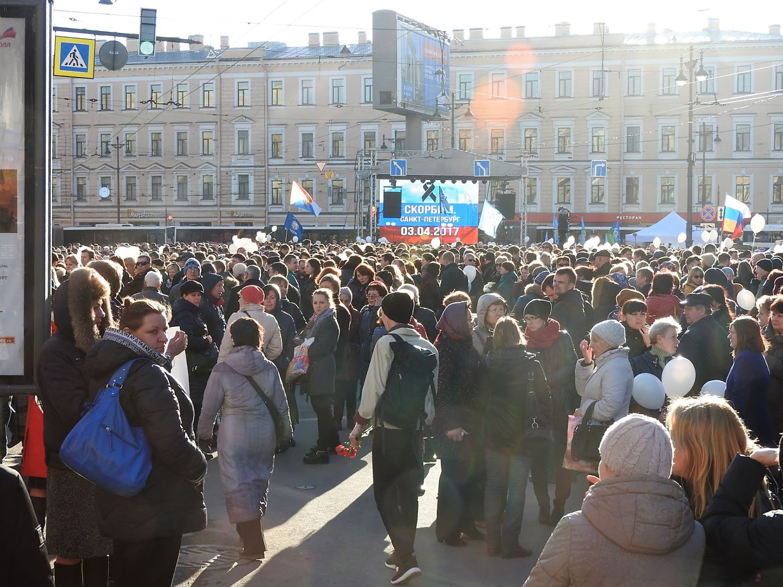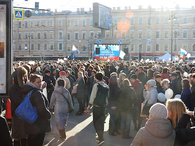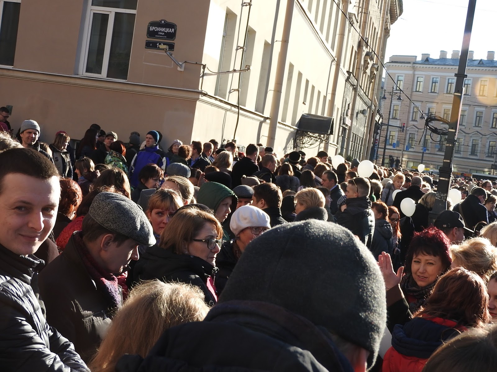 После митинга. Тут Смольный сообщил, что на акции было 30 тысяч человек, но, как пишет наша "прэсса", журналисты насчитали в 3 раза меньше. Как посетитель больших концертов, я знаю, что такое, например, заполненный зал Ледового, а это 12 тысяч человек. Или почти полный и практически весь стоячий зал СКК - это 25 тысяч. На Загородном и близко такого не наблюдалось. На этой фотке я стою как раз на углу Бронницкой и Загородного, впереди Московский. Тут уже довольно свободно и я вышла через пропускной пункт слева, на Бронницкой.