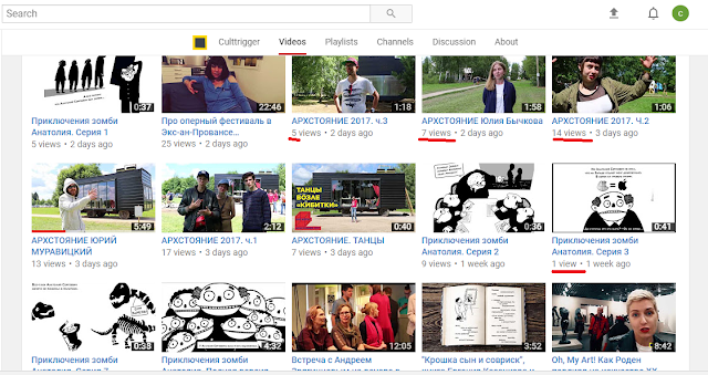 Как выглядел "разговор о культуре в таком ключе", подробно описал телеграм-канал "Нет значит нет" - тут текст в веб-версии. Действительно, ютюб-канал Культтриггера - это что-то с чем-то, кроме зрителей. 180 подписчиков, 1-7 просмотров на ролик, у некторых даже 25 просмотров, но благодаря этому тексту из Телеграма хиты набрали даже 200: