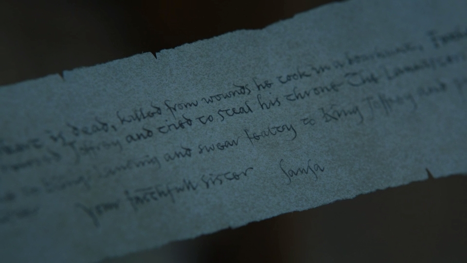 Тут я не выдержала и посмотрела в Авторитетных Источниках, что это было за письмо такое. Докладываю: письмо из первого сезона еще! Тогда Серсея, в присутствии Бейлиша и Вариса, между прочим, вынудила Сансу написать Роббу, чтобы заманить его в ловушку. Но Робб понял, что Санса по доброй воле никогда бы не назвала отца предателем, и собрался её спасать. Вот полный текст письма: Robb, I write to you with a heavy heart. Our good king Robert is dead, killed from wounds he took in a boar hunt. Father has been charged with treason. He conspired with Robert’s brothers against my beloved Joffrey and tried to steal his throne. The Lannisters are treating me very well and provide me with every comfort. I beg you: come to King’s Landing, swear fealty to King Joffrey and prevent any strife between the great houses of Lannister and Stark.