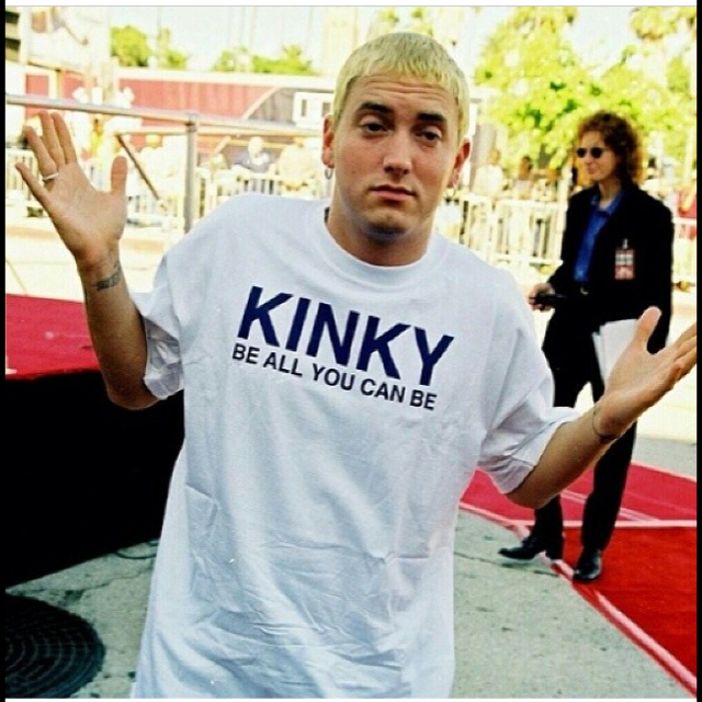 И трогательный эпизод, как он стал блондином. Дре сказал ему, что запись у них есть, теперь надо придумать образ. Эминем понятия не имел, как должен выглядеть Слим Шейди. Но как-то они с Ройсом пошли гулять, наемшись экстези в избытке, и купили перекись водорода в аптеке, сами не знали зачем. На утро (в 2 часа дня) Эминем увидел себя в зеркале и не мог вспомнить, как он выкрасил волосы. Он явился в студию со свежекрашенной головой и в белой футболке, потому что он всегда в такой ходил за неимением ничего другого. Дре уставился на него и не мог сказать ни слова. А потом закричал "Вот оно! Мы нашли твой образ!". Джимми Айовин заглянул узнать, что за шум, и тоже пришел в ажитацию - "Вот твоя личность! Вот что мы искали столько времени!".