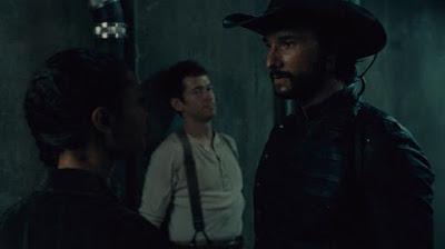 Бернард (старый Бернард в очках, новый - без) с Шарлоттой Хейл идут по следу Абернати с планшетом, который указывает его положение (а система не работает при этом, да?), находят, переключают Бандита с Молоком в режим "Защитник женщин и детей", получают своего Абернати, который поет песни и читает проповеди (интересно, как он в таком состоянии в поезде должен был "незаметно" уехать). Но тут по законам кондового вестерна приезжают конфедерадос, Бернард с Абернати сидят под кустом, вытращив глаза, а Шарлотта уезжает на лошади, причем в неё стреляют, но то ли не попадают, то ли оружие еще работает.