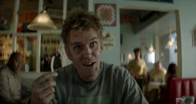 Вся это история про множество вариантов судьбы одного человека, переживание потери, про страдание, про чертовы вечные голоса в голове, про невозможность счастья для вот этого конкретного Дэвида, рассказана с помощью одних только картинок и музыки. Вы знаете, я враг саундтреков, ими прикрывают режиссерскую и актерскую беспомощность, но в "Легионе" музыка играет ту роль, которую и должна. Она не отделима от картинок. И еще Холи очень здорово чувствует эмоцию и ведет за ней. Если бы все серии были такими!
