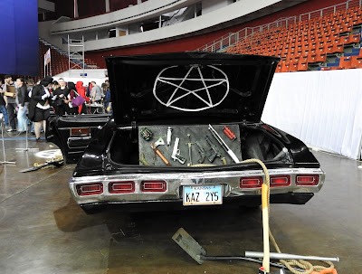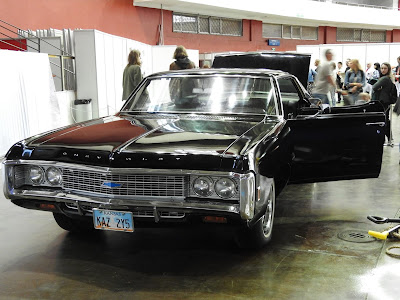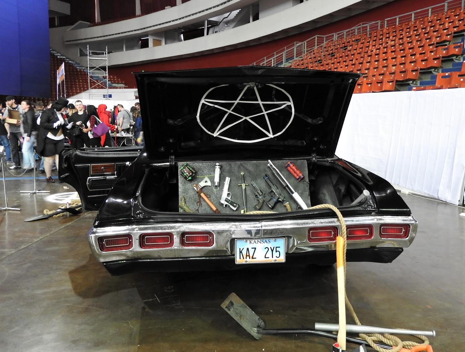 Это не бутафория, это настоящая Шеви Импала, правда, по-моему, не 67-го года, она немного отличается от канонической. Её хозяин не фанат СПН, он фанат Импалы. Купил её где-то в начале 90-х, что ли, в Москве. Еще до всякого сериала, - сказал он мне. Ну а потом уже братья Винчестеры добавили дополнительных смыслов.Ну и для выставки тут создали кое-какой антураж, хотя могли бы просто поставить без всего. Правда, спн-овский фэндом, кажется, скис последнее время.