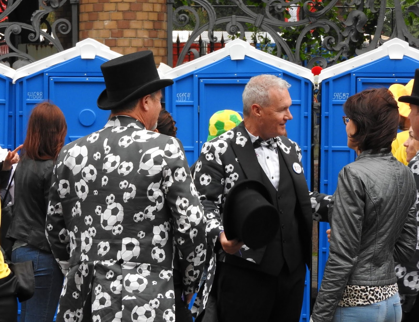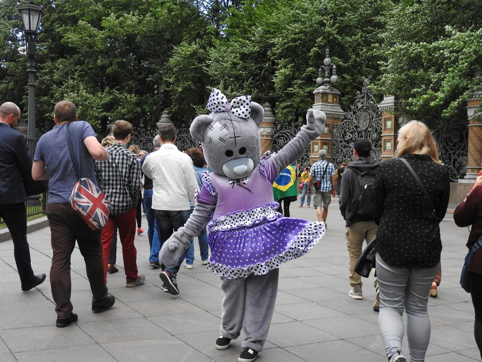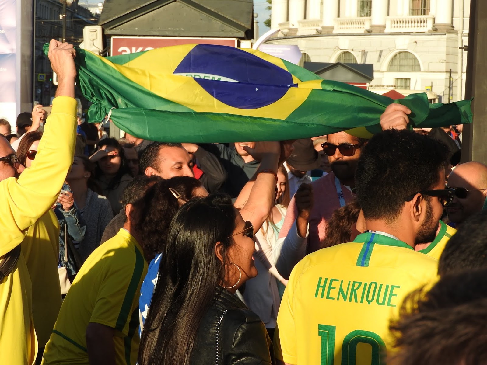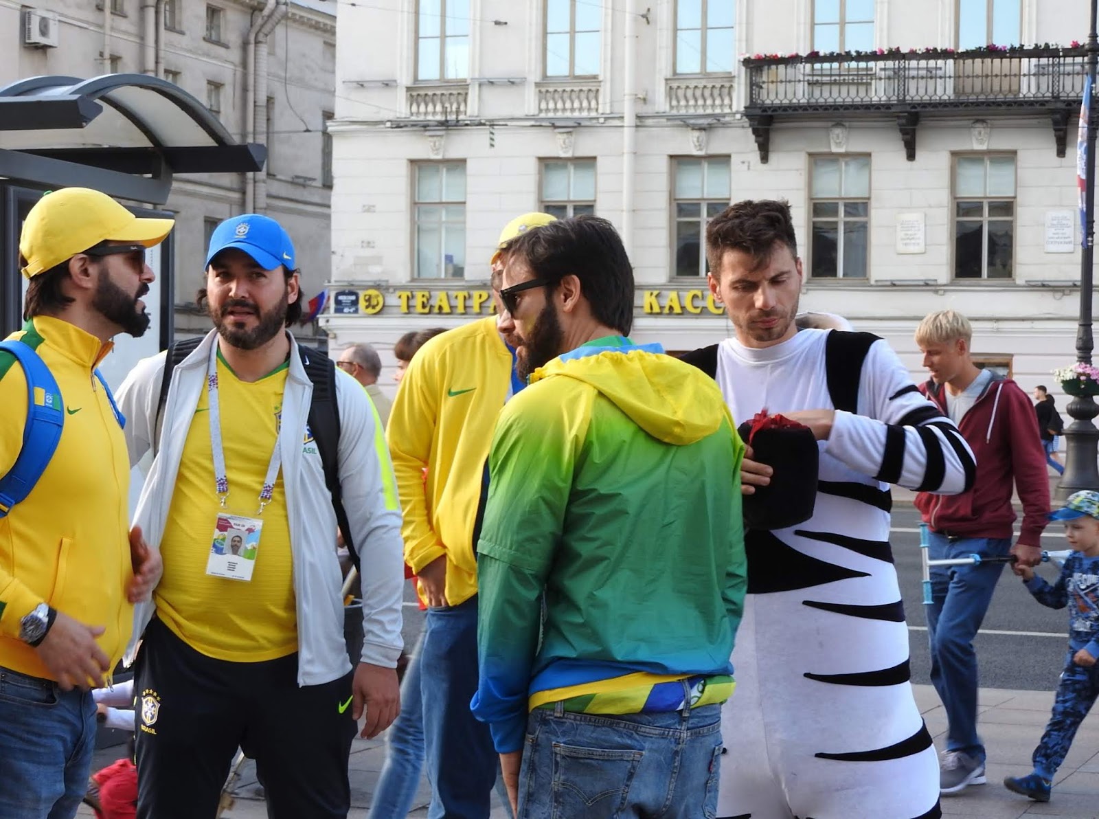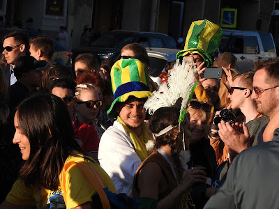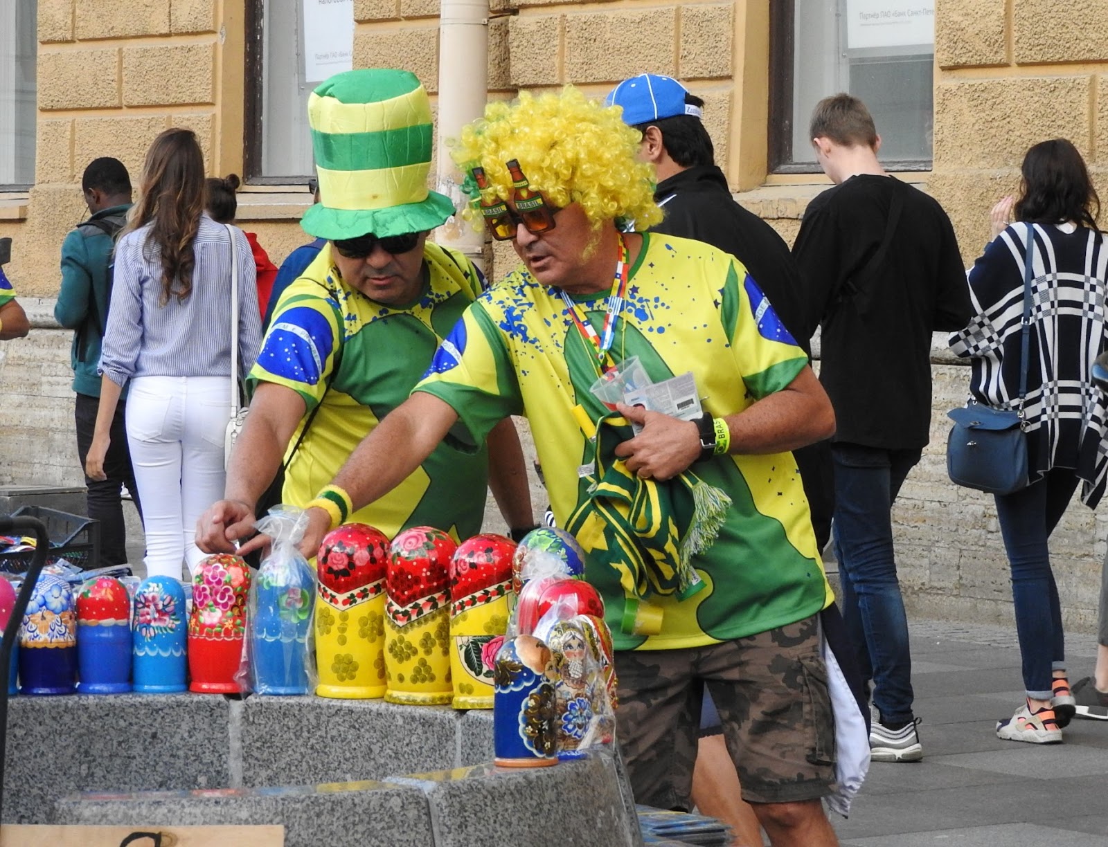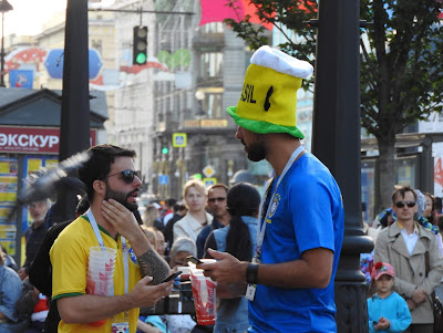 И о футболе - ч.1 У нас сегодня играли Бразилия с Коста-Рикой, бразильцы выиграли, и я вылезла на Невский посмотреть на болел. Потому что у нас в Коломне тишина и покой, а главный футбольный аналитический центр находится в магазине для бедных "Верный", там пожилой охранник в момент образует клуб спортивных обозревателей с мужиками в очереди в кассу. Футбольные лорды на фоне сортира Бразильцев было много. И все они похожи друг на друга. Они, канеш, дети фавел, и история с неприличной песней меня не удивляет после сегодняшнего, но в целом нормальные, просто развязные и сексуально озабоченные. Почему-то все болельщики таскали с собой стопку пластиковых стаканов. Видимо, это какой-то набор любителя футбола. Может, в такой стакан наливают со скидкой... Поверженные коста-риканцы попрятались или сидели грустные. Зато желтые бразильцы скакали козлами. Вся толпа двинулась от метро к фанзоне, путь к которой проходил через сувенирные ряды. Как остроумно, хехе. Нам нужна эта матрёшка, брат: А нам норковая ермолка: Накупив шавермы, они добрались до фанзоны, где на них набросились китайцы. Китайцы, как я недавно отмечала, стали более открытыми: