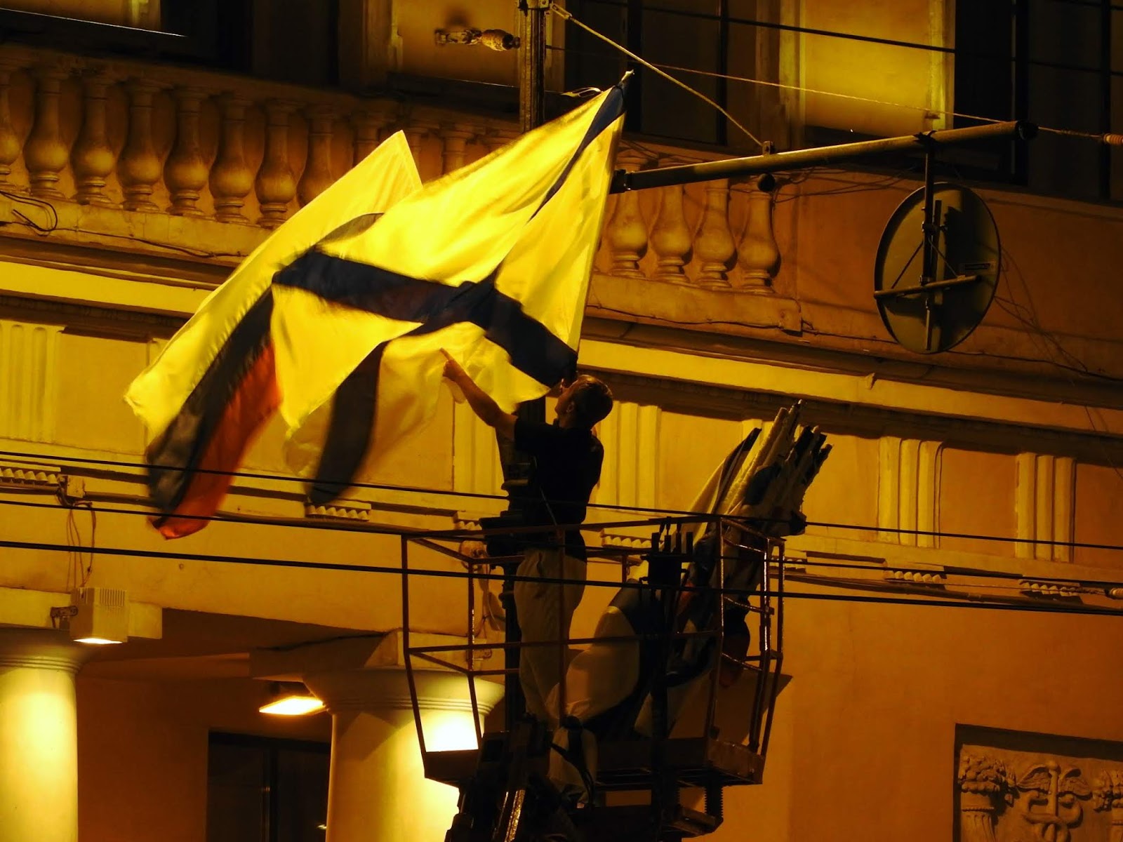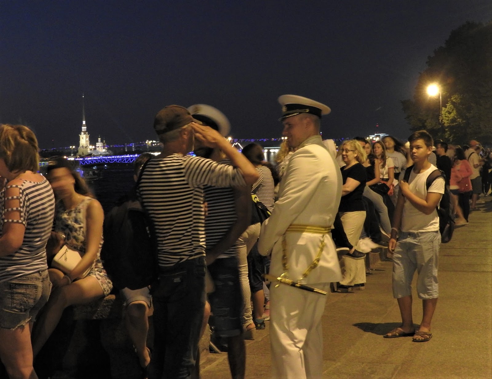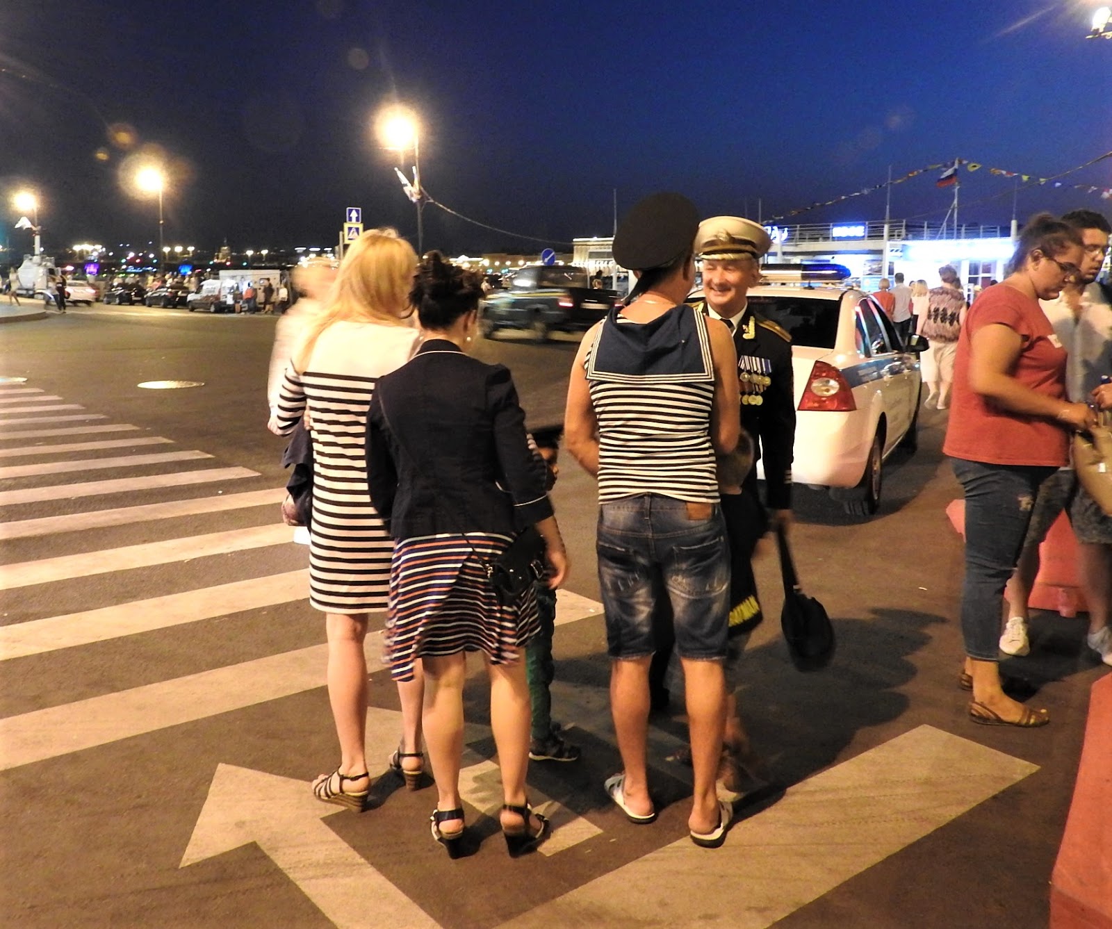 День ВМФ Народу тьма, моряки поздравляют друг друга на улице.
