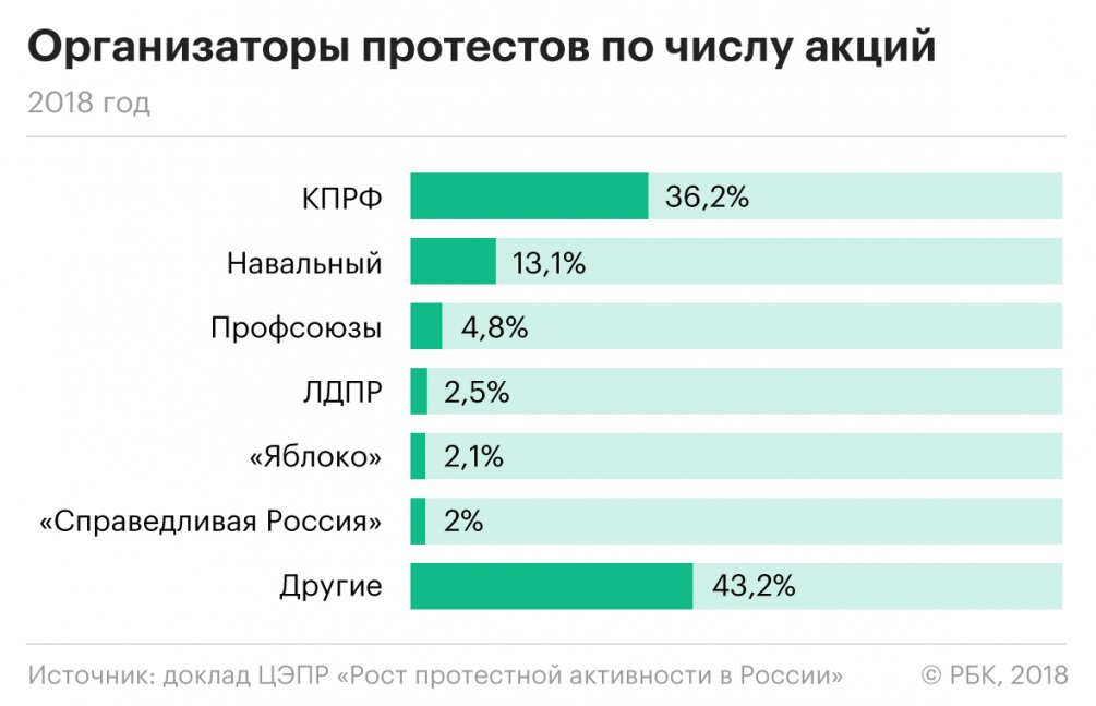 Анатомия протеста РБК пишет, что в этом году Петербург оказался самым протестным городом - протестовали много и разнообразно. По политическим инициаторам же силы распределились вот так: