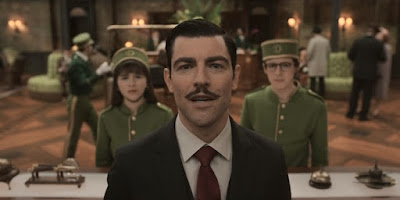 Но сардонический тон потерялся среди этих замечательных декораций, а культурные отсылки стали звучать натужно. В общем-то история держалась уже только на красивой картинке до финальной серии, когда Вайолет, Клаус и Санни Бодлер попадают на тропический остров, который по сути есть Эдем, где по среди кущ (кущи изначально это не кустики, а домики) встречают "бога", удерживающего свою паству в блаженном неведении с помощью опиатов. Среди розовых овец.
