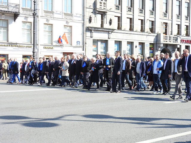 И действительно, горожан это всё не интересует, судя по тишине на Невском. Но на всяких случай росгвардию наставили через каждые два метра, полицейщины развели, как в тюрьме - с тротуара не сходить, стоять ровно по линии бордюра, выпучив глаза. При том по проезжей части бегает тьма народу вне колонн, но видимо, если ты линию пересек и присоединился к демонстрантам, то ты уже вне зоны ответственности усердных росгвардейцев (здесь могли быть обидные для них слова).