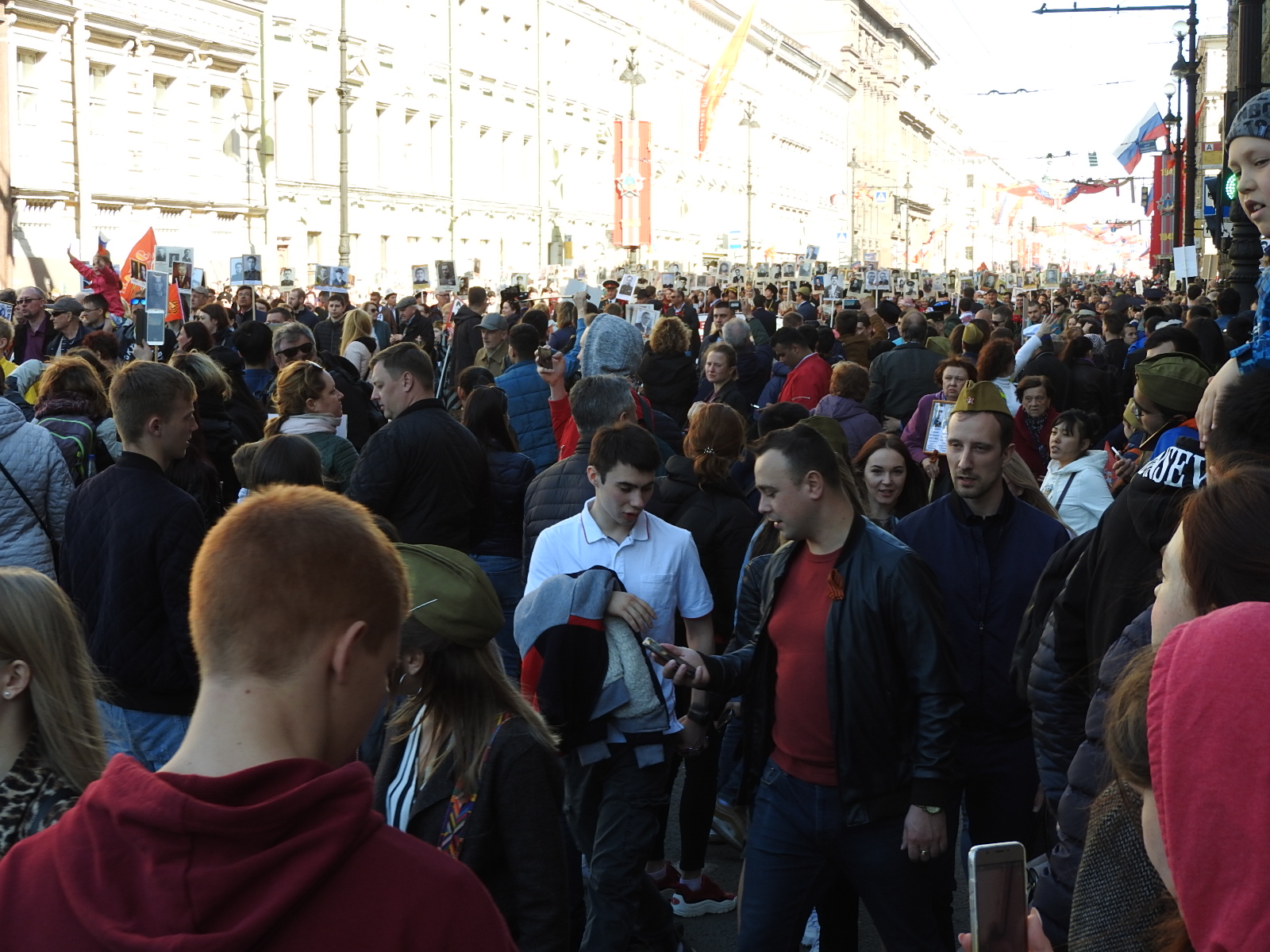 На Полку очень много народу. Ленточек и косплея, если не считать казенного - у нас же в городе курс на толерантность, поэтому на День Победы впереди идут люди в национальных костюмах, значительно меньше, а людей на марш приходит очень много.