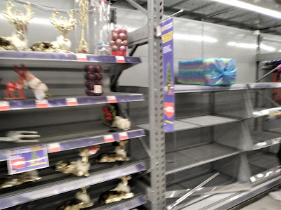 В нашей "Ленте" Новоый Год закончился уже вчера - все стеллажи с ёлочными игрушками, которых и так было немного (ярмарка в Хипстерятне тоже была очень скромная, просто карликовая), срочно разобрали и стали раскладывать там швабры и бумажные полотенца (сорян за мутную фотку, снимала на бегу):