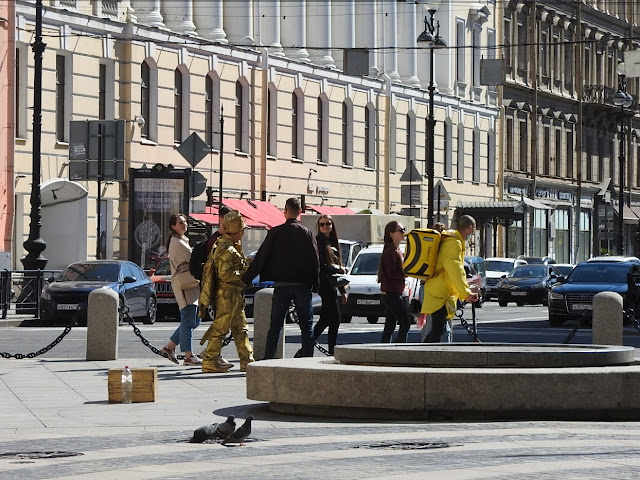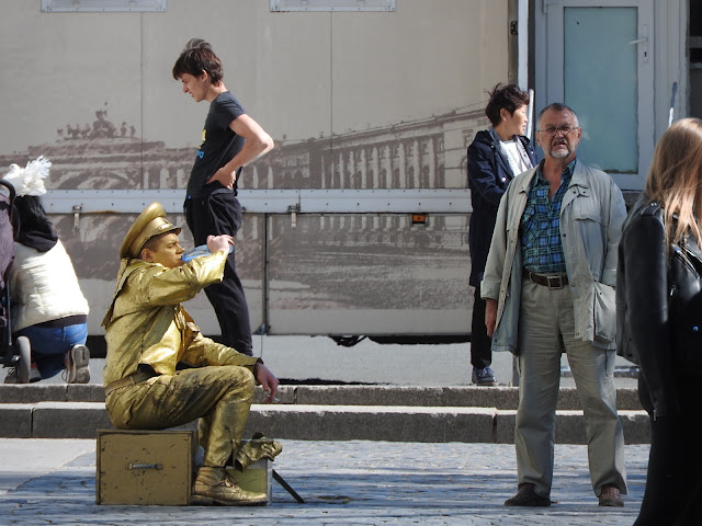 Прибыла банда "живых статуй", они нападают на прохожих и тащат их фотографироваться, за деньги, само собой. Пикет, значит, нельзя, а стоять на ящике за бабки можно.