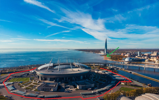 И использовали в тексте очень удачную фотографию стадиона. Потому что его стараются снимать и кадрировать так, чтобы уродство в кадр не попадало. Так вот на этой панораме видно, что стало с территорией, которая раньше была открыта и доступна. Красной линией я обвела границу заграждений. Зеленая стрелка указывает на тот самый пляж, а за ним виден парк 300-летия.